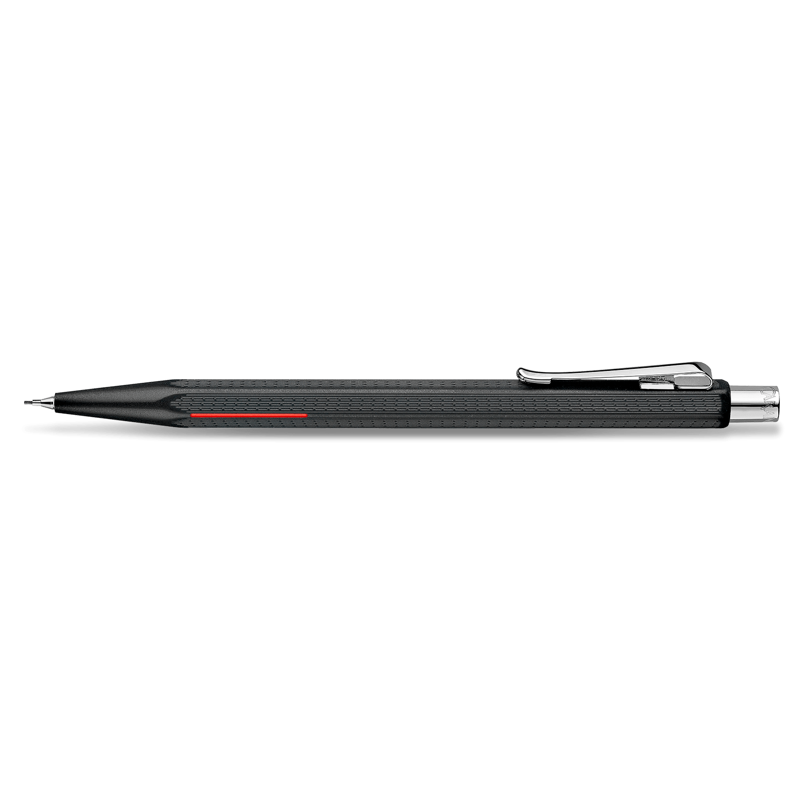 The Caran d'Ache Ecridor™ Racing Mechanical Pencil embodies precision and elegance with its hexagonal brass body and a distinctive black chrome coating. The sand finish offers a matte texture, while machine-cut guillochage, inspired by the radiator grills of race cars, adds a bold edge. Hand-applied red lacquer details evoke brake lights, enhancing its dynamic design. Finished with a palladium-plated push-button and flexible clip, this pencil is a statement of Swiss craftsmanship. Packaged in a luxurious leather case, it’s perfect for those who appreciate refined performance and style.